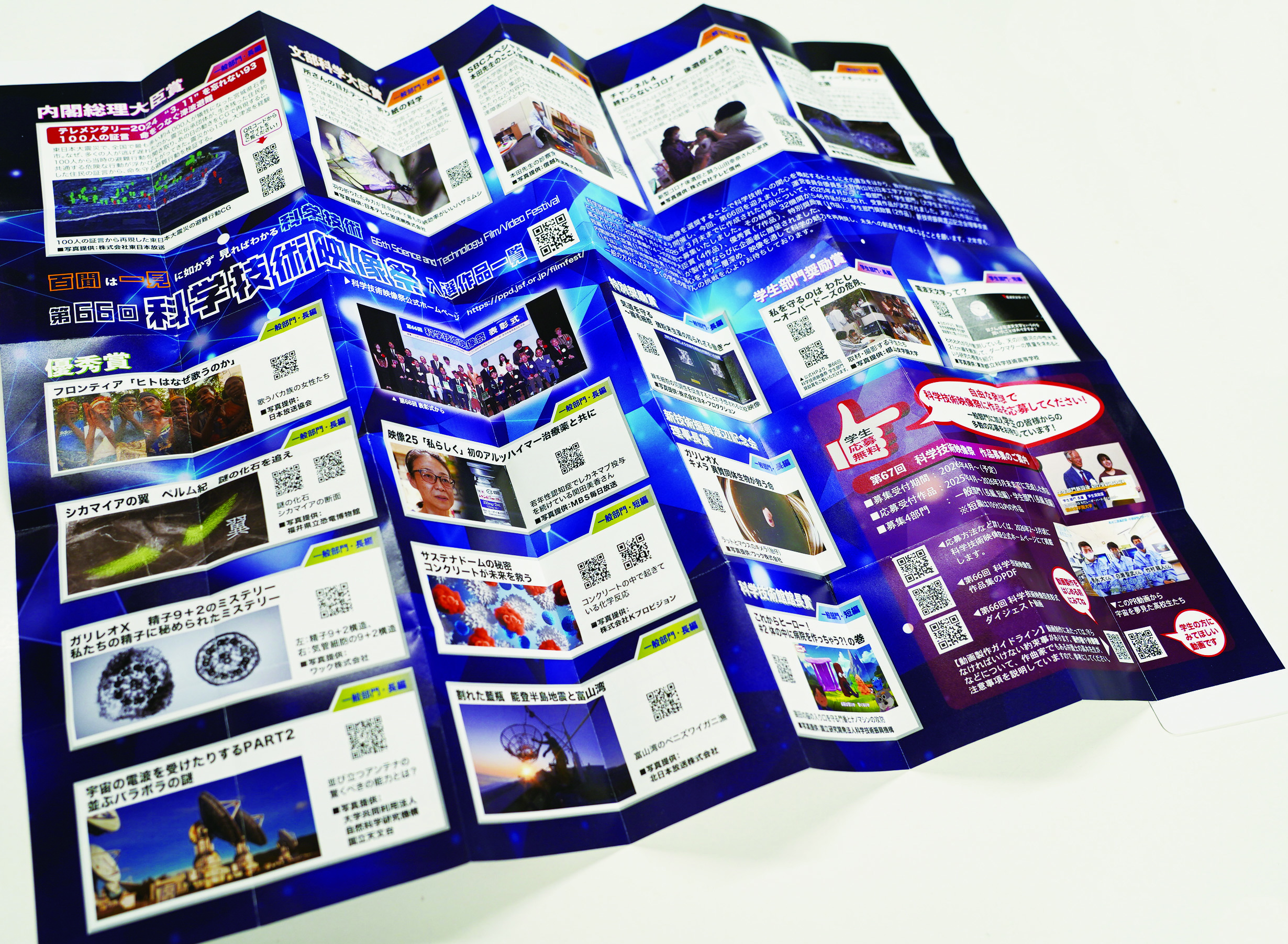 科学技術映像祭優れた科学技術映像を選奨し、科学技術の普及と向上を図るための映像コンクール。1960年より毎年開催し、決定した作品には内閣総理大臣賞、文部科学大臣賞、部門優秀賞他の賞が贈られる。主催:日本科学技術振興財団、映像文化製作者連盟、つくば科学万博記念財団、新技術振興渡辺記念会