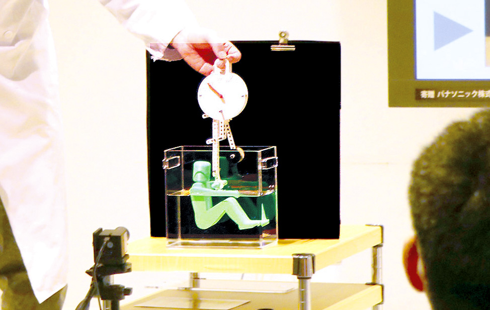 皆様は、「お風呂」と聞くとどのようなイメージを連想するでしょうか? 「あたたかい」「きもちいい」「つかれがとれる」といったことが多いと思います。このプログラムでは、それらの元になる「お風呂の3大作用」といわれる「温熱」「浮力」「水圧」をどのように扱うかを検討の末、まずは「浮力」「水圧」を、さまざまな実験器具で分かりやすくお見せすることになりました。